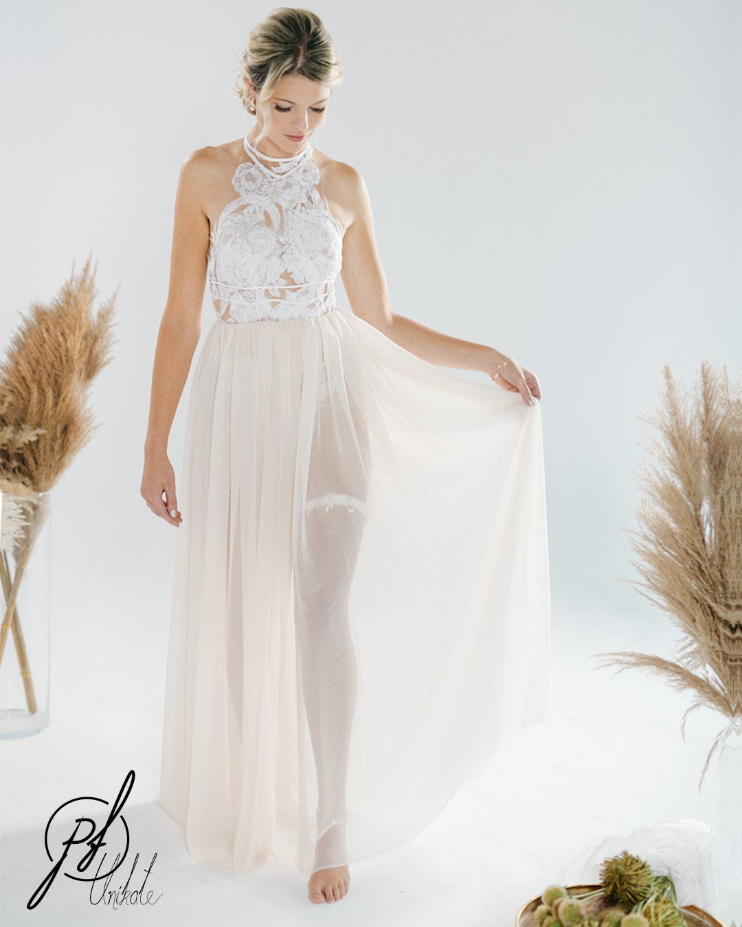 Unser Brautkleid Avril besteht aus einem wunderschönen Spitzenbody und einem reinen Seidenrock mit mehreren zarten Lagen, welche weich Deine Beine umschmeicheln.